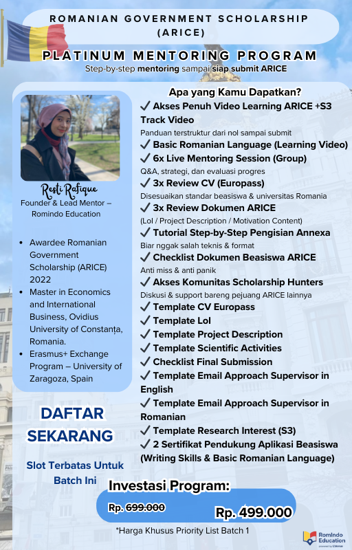 Platinum Mentoring Program ARICE adalah program mentoring paling lengkap dan intensif untuk pejuang Beasiswa Romanian Government Scholarship (ARICE) yang ingin pendampingan maksimal, detail, dan strategis hingga tahap submit.